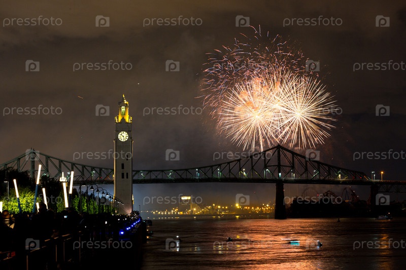 Монреальская часовая башня и мост Жака Картье с фейерверками ночью во время летнего праздника