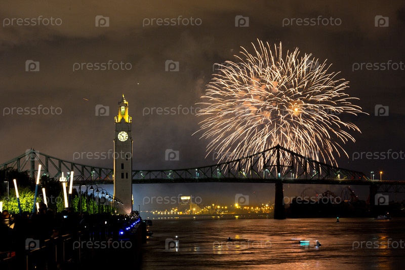 Монреальская часовая башня и мост Жака Картье с фейерверками ночью во время летнего праздника