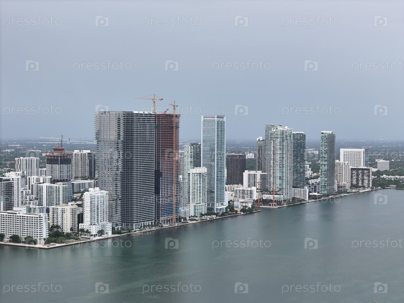 Майами в центре города с современными высотными зданиями и мостом через залив при облачном дневном свете