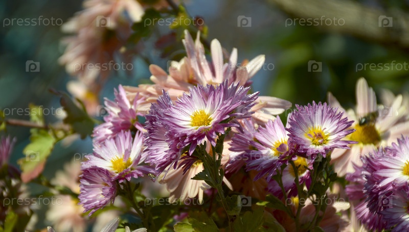 Красивые осенние цветы с каплями росы на нежных лепестках. цветок сада после дождя в лучах заходящего солнца. красота в природе