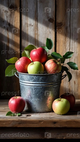 Урожай свежих красных яблок. Разноцветные спелые яблоки лежат в алюминиевом ведре на деревянных досках. Деревенский урожай