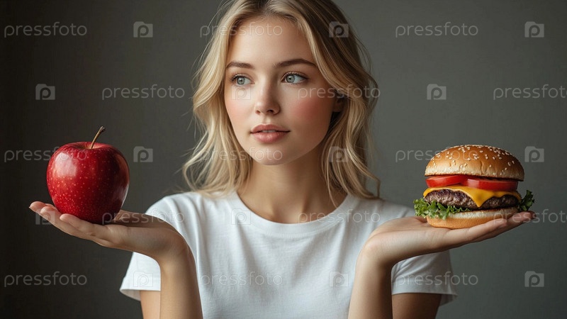 Концепция выбора здорового питания. Выбор между полезной и вредной пищей