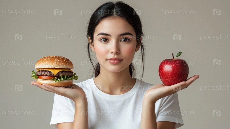 Концепция выбора здорового питания. Выбор между полезной и вредной пищей