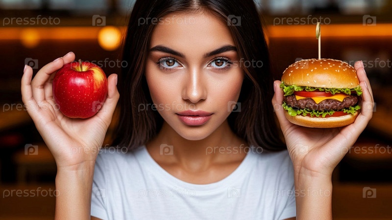 Концепция выбора здорового питания. Выбор между полезной и вредной пищей: яблоко или гамбургер. Диета