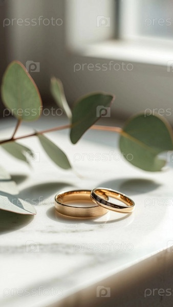Два золотых свадебных кольца на светлом фоне и лист эвкалипта