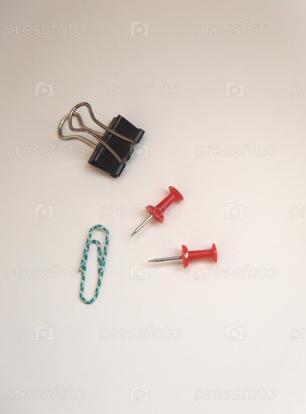 Канцелярские предметы скрепка, зажим и другое на бумаге