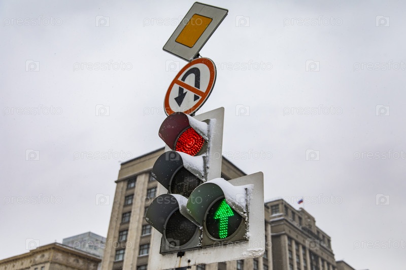 Светофор со стрелками и дорожный знак «разворот запрещен» зимой в Москве