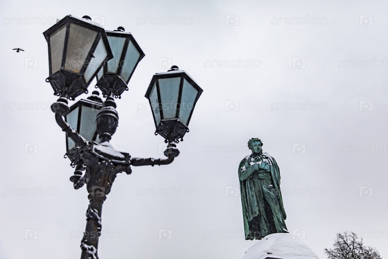 Старинный уличный фонарь и бронзовая статуя Александра Пушкина на фоне зимнего неба