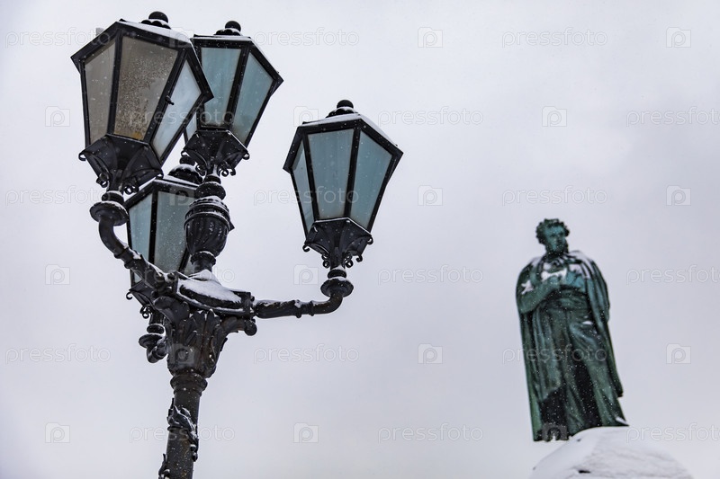 Старинный уличный фонарь и бронзовая статуя Александра Пушкина на фоне зимнего неба