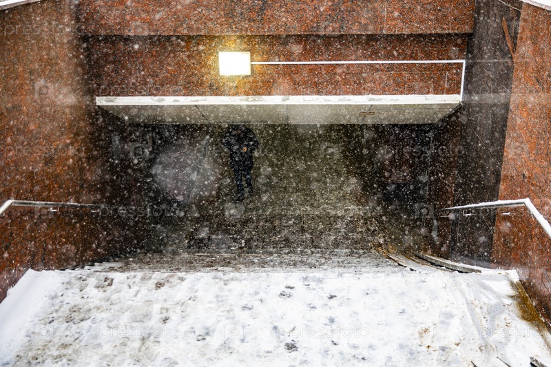 Снегопад у входа в подземный переход с лестницей