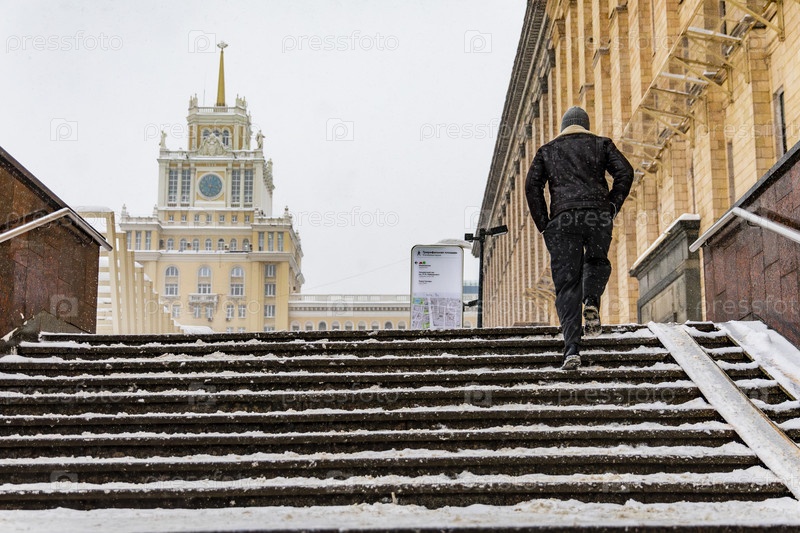 Зимний пешеход на лестнице на фоне гостиницы 'Пекин' в Москве