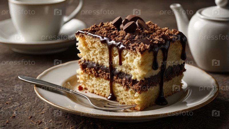 Вкусный кусочек торта с шоколадной начинкой и чашкой кофе на столе