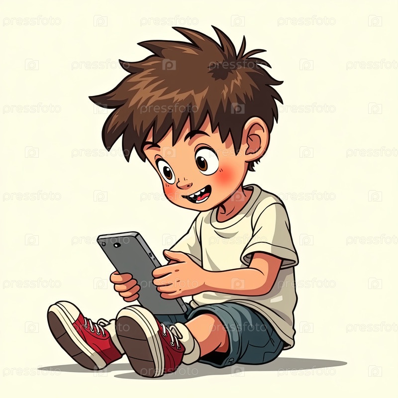 Мультфильм о сидящем маленьком мальчике с растрепанными волосами, играющем со смартфоном