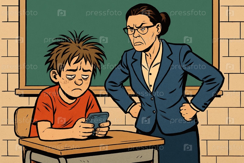 Иллюстрация строгого учителя, ругающего студента с помощью смартфона в классе