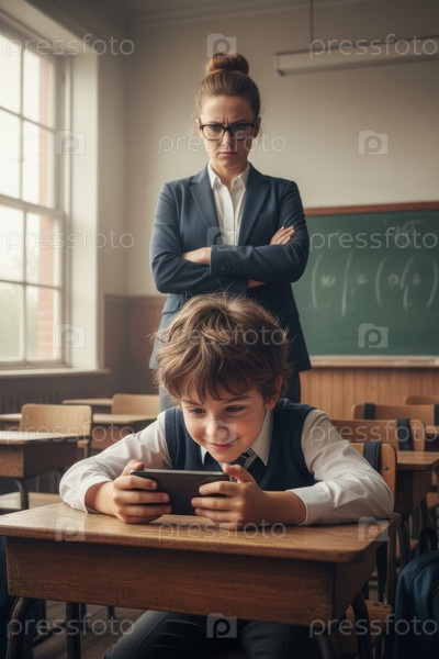 Студент использует смартфон в классе, в то время как учитель внимательно наблюдает