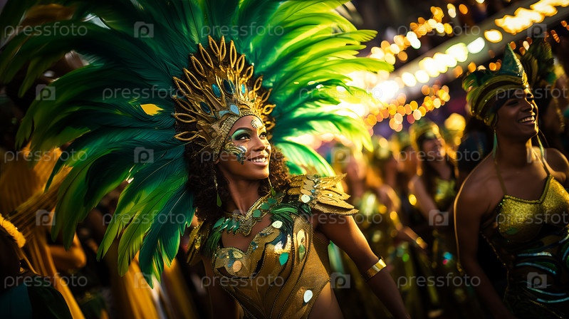Захватывающий образ, запечатлевший суть карнавала в Рио, демонстрирующий танцора, украшенного сложным, ярким костюмом, воплощающим дух и энергию этого знакового фестиваля