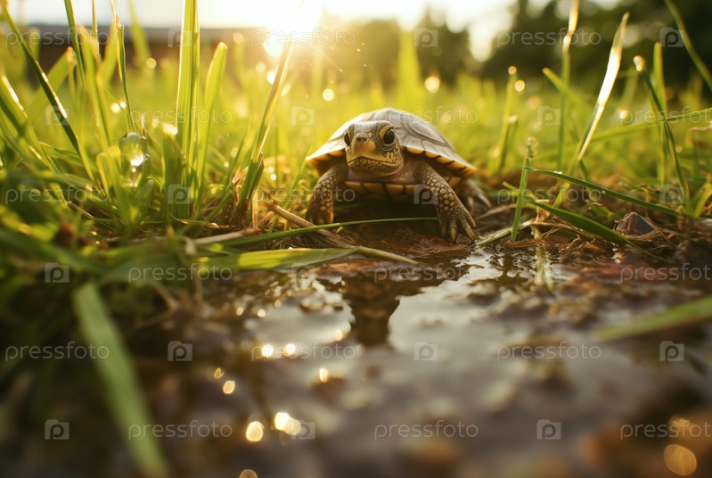 Симпатичная маленькая черепаха ползает по траве, освещенная золотыми лучами заходящего солнца