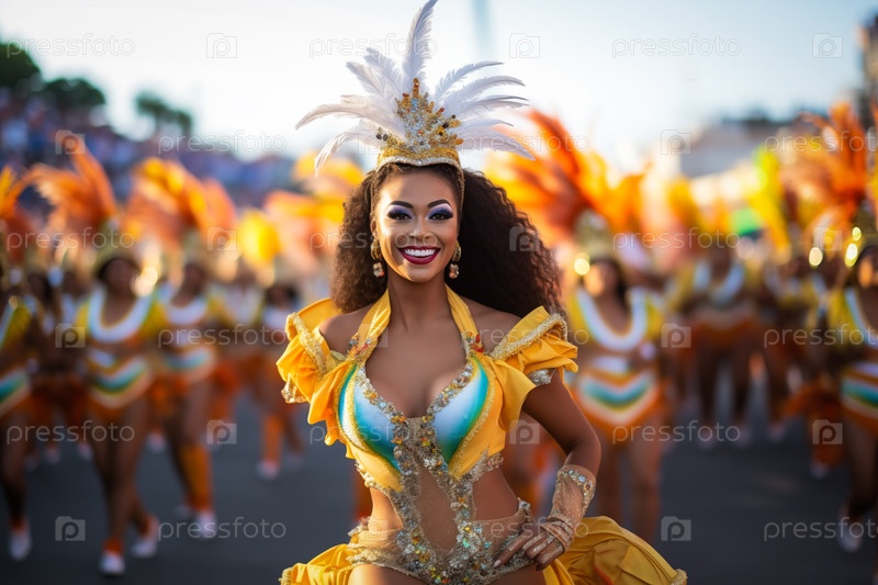 Захватывающий образ, запечатлевший суть карнавала в Рио, демонстрирующий танцора, украшенного сложным, ярким костюмом, воплощающим дух и энергию этого знакового фестиваля