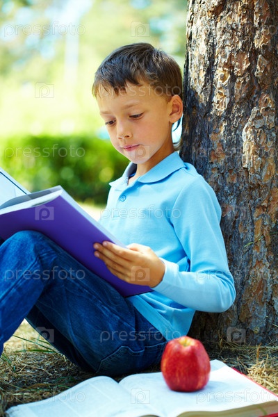 Мальчик читает книгу на природе