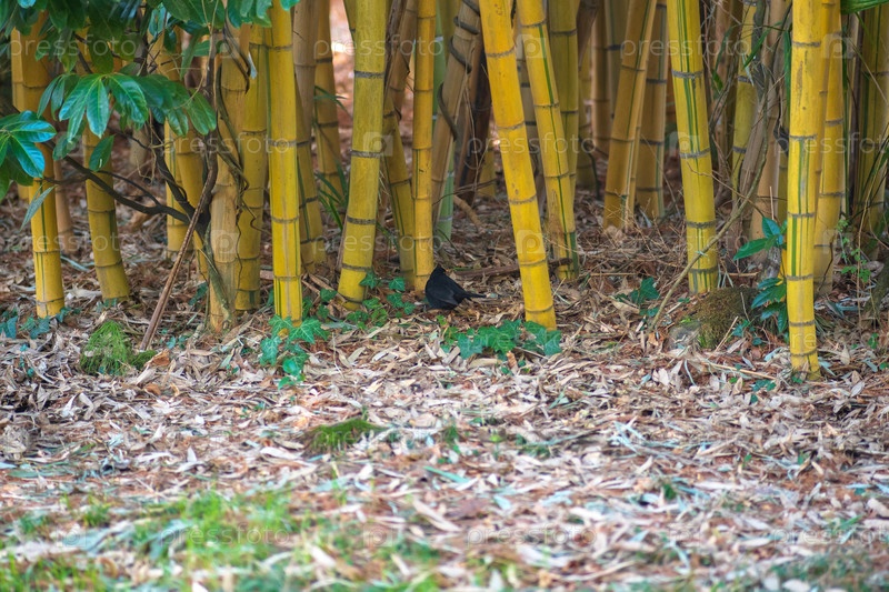 Черная птица сидит на полу бамбукового леса и ищет еду,