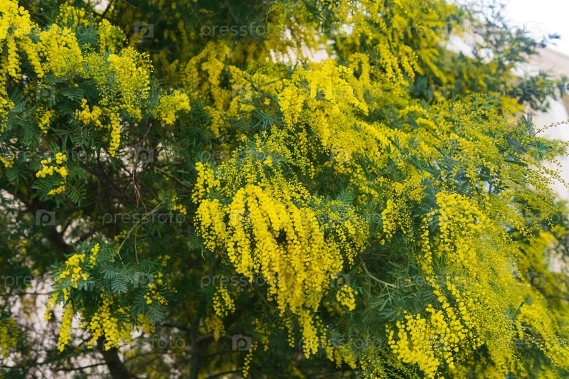 Дерево Мимоза с желтыми цветами. Цветущее дерево mimosa