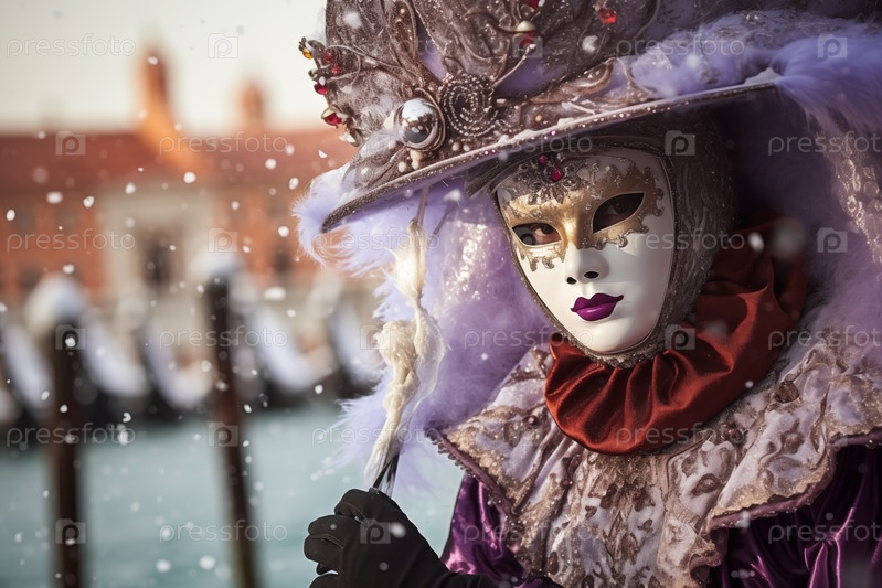Человек, украшенный богато детализированным и красочным карнавальным костюмом, в комплекте со сложной маской, участвует в знаковом Венецианском карнавале со снегопадом