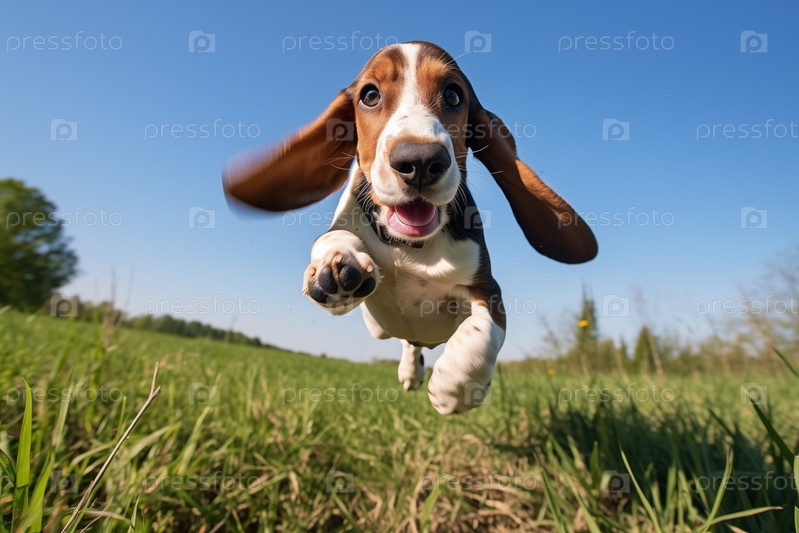 Снимок крупным планом игривого щенка Basset Hound с гибкими ушами, бегом, прыжками и исследованием на открытом воздухе