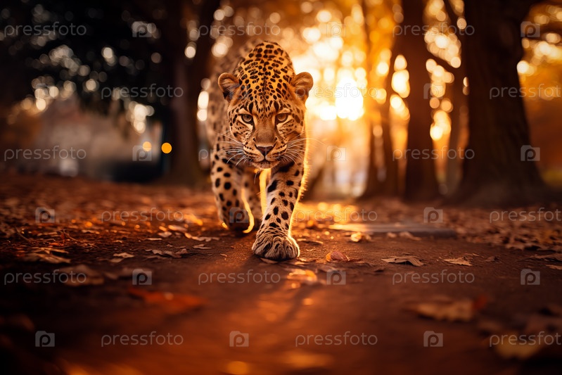 Малыш леопард уверенно идет в золотой час, демонстрируя свой пятнистый мех и невинный глаз