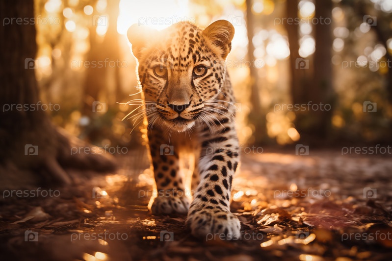 Малыш леопард уверенно идет в золотой час, демонстрируя свой пятнистый мех и невинный глаз