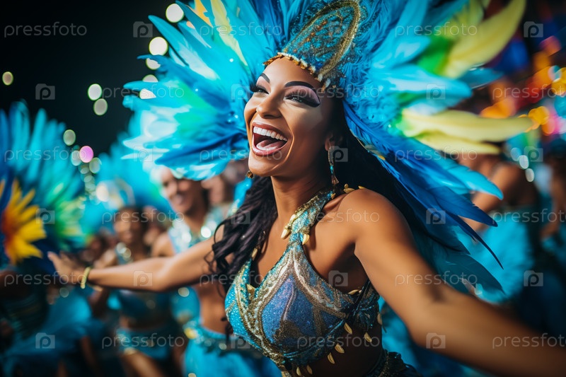 Захватывающий образ, запечатлевший суть карнавала в Рио, демонстрирующий танцора, украшенного сложным, ярким костюмом, воплощающим дух и энергию этого знакового фестиваля