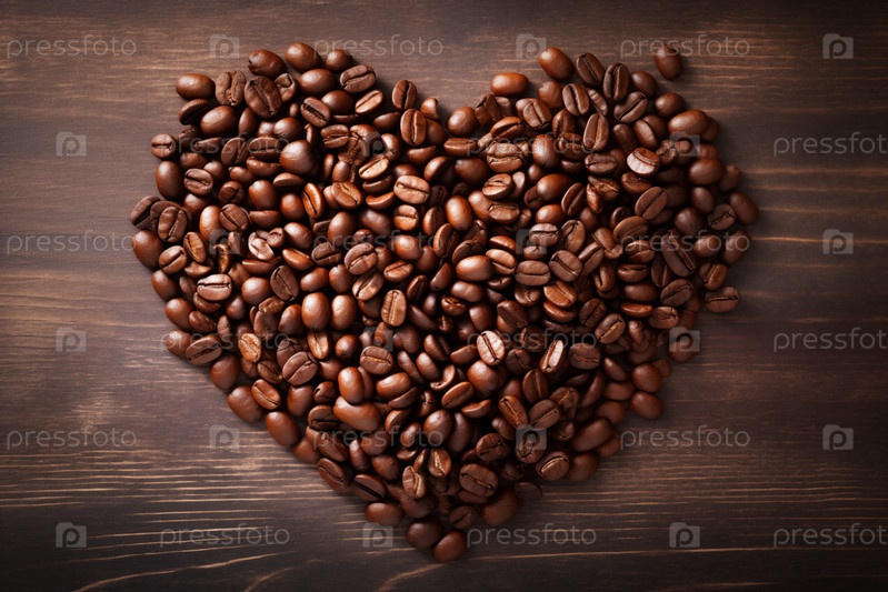 Форма сердца из богатых темных кофейных зерен расположена на деревенском деревянном фоне, символизирующем любовь к кофе