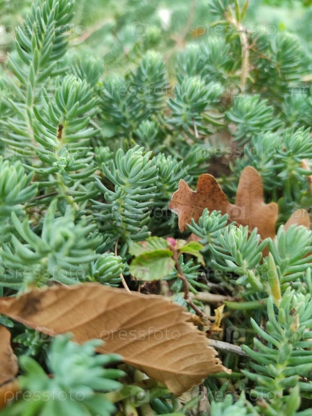 Пышные зеленые суккуленты с осенними листьями — естественный фон, обои