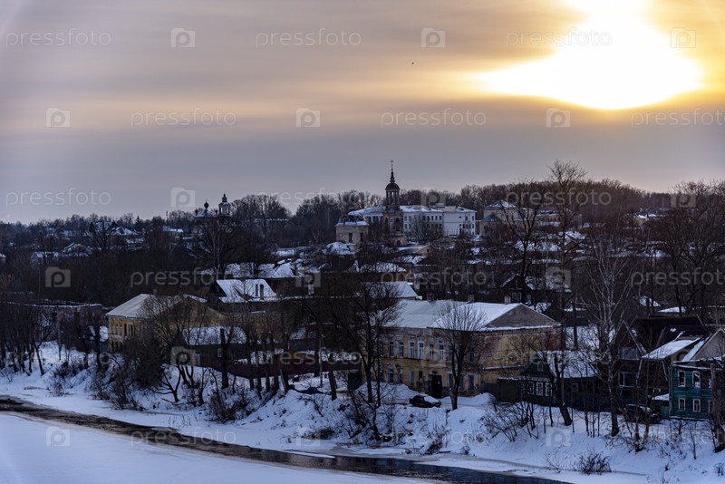 Зимний закат над историческим городским пейзажем на берегу реки