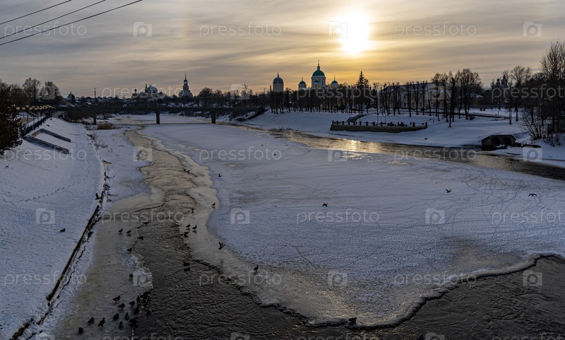 Зимний закат над замерзшей рекой в безмятежном городском пейзаже