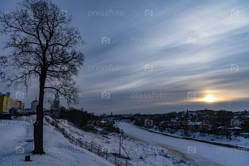 Безмятежный зимний закат над заснеженным речным пейзажем