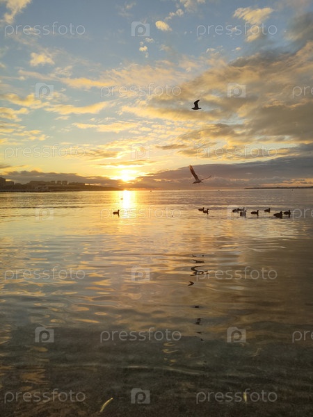 Закат с утками на воде золотой пейзаж, спокойствие, фон, обои