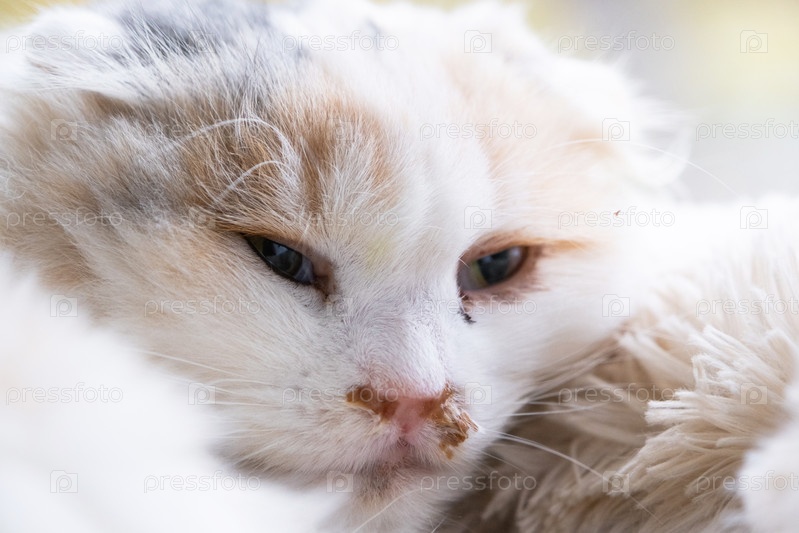 Гнойные сопли из носа белой кошки, ветеринарное лечение аллергии, насморк, инфекционное и вирусное воспаление