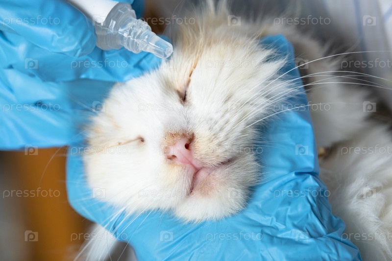 Ветеринар в резиновых перчатках бросает лекарство от конъюнктивита в глаз кошки. Лечение домашних животных дома
