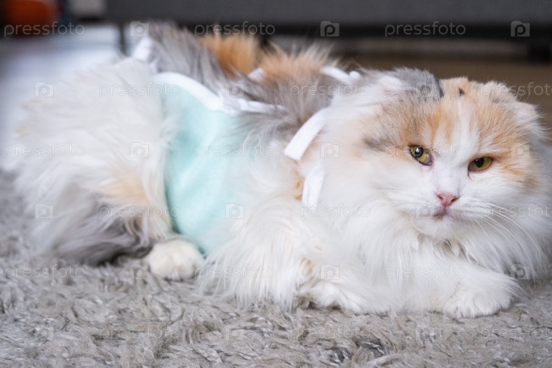 Триколор Кошка в повязке дома восстанавливается после операции по стерилизации