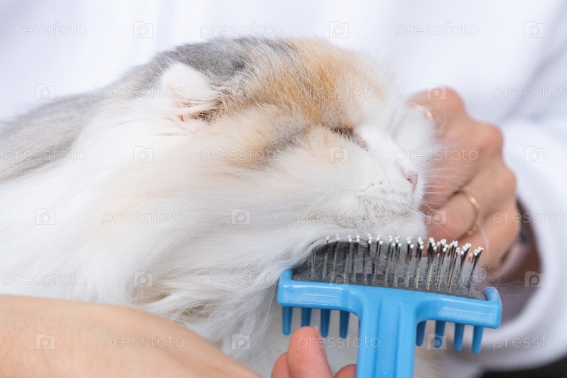 Объедините белую домашнюю кошку крупным планом, ухаживая за ее мехом гребнем. Кошка любит расчесывать