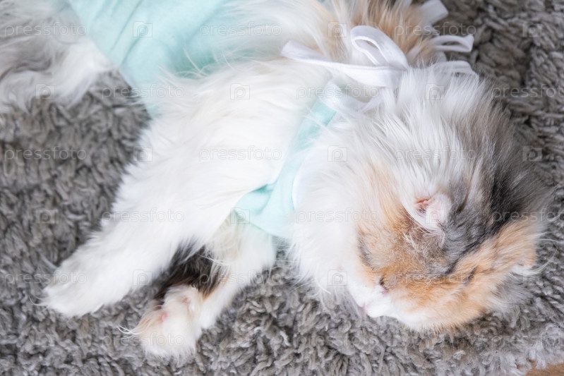Белый кот в повязке дома восстанавливается после анестезии после операции по стерилизации, спит