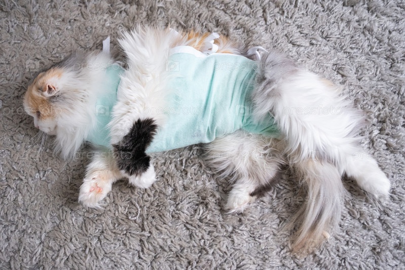 Белый кот в повязке дома восстанавливается после анестезии после операции по стерилизации, спит