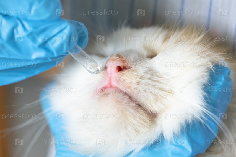 Ветеринар в резиновых перчатках бросает лекарство от простуды в нос кошки. Лечение простуды и аллергии дома