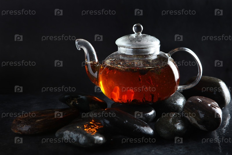 Чай в прозрачном стеклянном чайнике. Черный чай. Горячий напиток