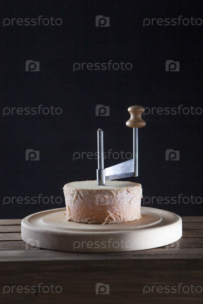 Традиционный сыр Tete des Moines на деревянной доске. Специальный нож для нарезки сыра «Жирол». Черный фон. Копируйте пространство