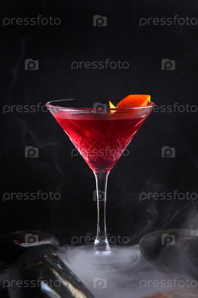 Космополитический алкогольный коктейль на основе водки, ликера, сока лайма и клюквенного сока. Коктейль в высоком бокале. Темный фон