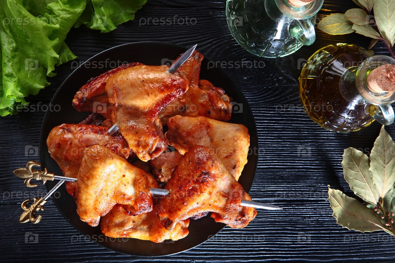 Шиш-кебаб куриных крылышек. Жареные или барбекю куриные крылья на борту. Темный фон. Вид сверху
