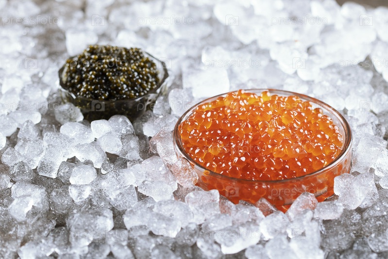 Красная и черная икра. Красную и черную икру помещают на лед. Естественная омега и деликатес для праздничного стола