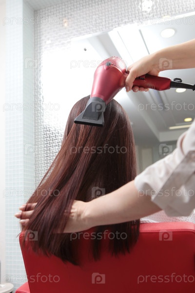 Сухие длинные каштановые волосы с феном и плоской щеткой. Забота о волосах. Понятие красоты