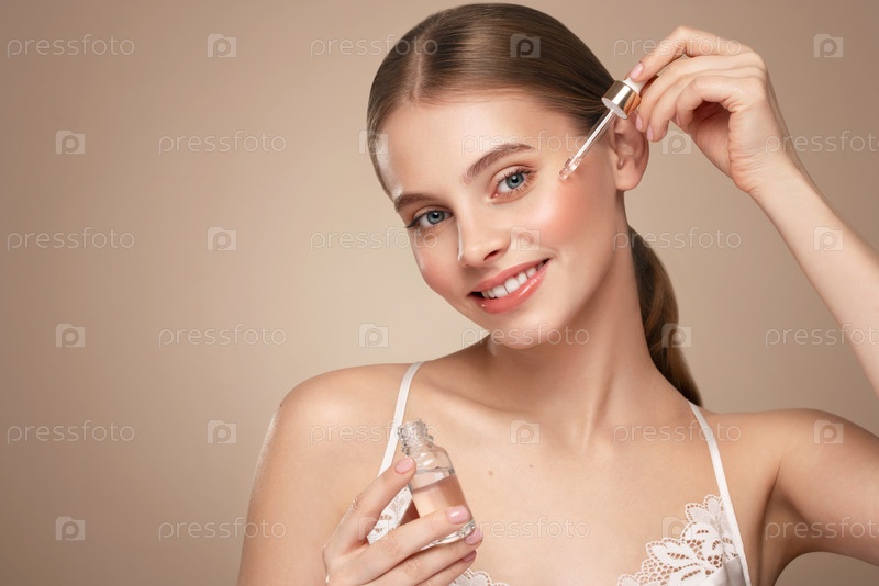 Молодая красивая женщина применяет сыворотку лица